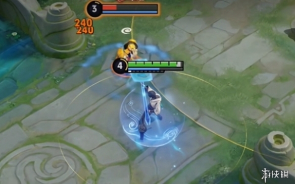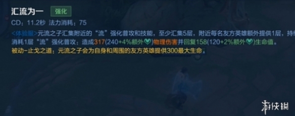除了加血之外,元流之子的一技能还可以汇聚能量,为自己最少提供五层,每多一位队友多一层,最多九层。之后的每次普攻会消耗能量,以此来造成额外伤害和为自己回血。由此可见坦克定位的元流之子的一技能完全是一个打团英雄,技能既增强队友也能为自己提供收益。
