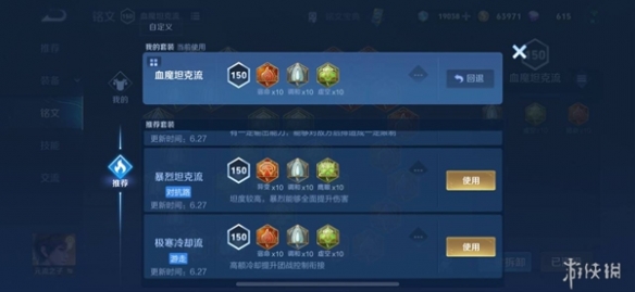第一套出装搭配的铭文为10异变、10调和、10鹰眼,后两套为10宿命10调和、10虚空。