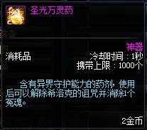 圣光万灵药是DNF中比较古老的消耗品之一,但是对于很多普通玩家来说可能听都没有听说过。因为是粉色的消耗品,加上很多人又对它不了解,所以误认为是"洗点水",有的人还利用它来骗取新手玩家的金币。