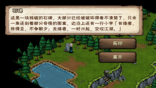拓片一,锦屏山(1,38)处拓印石碑,此处需要丹青技艺后续需跟猎户对话打听残碑;