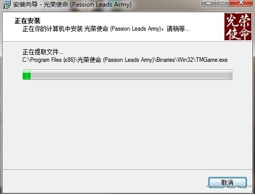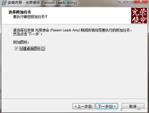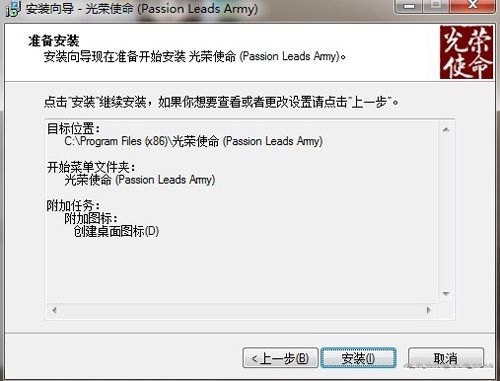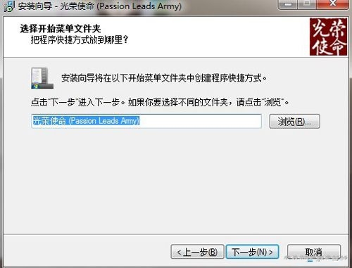 软件安装时会在C:\Program Files下创建名为光荣使命(Passion Leads Army)的子文件夹,用户可点击浏览更改文件夹的名称,点击下一步;